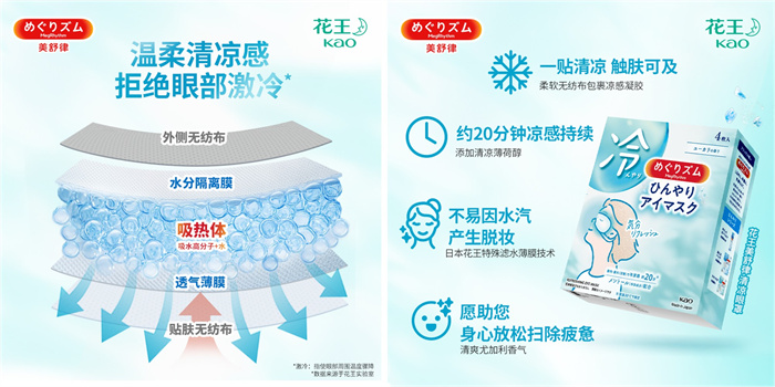 此次新上市的“花王美舒律清凉眼罩”采用花王特殊滤水薄膜技术,通过蒸发吸热效应配合清凉薄荷醇成分,帮助眼周皮肤徐徐清爽降温,避免眼部激冷的同时减少眼周潮湿、黏腻等不适感,温柔清凉感长达约20分钟*1。柔软无纺布包裹凉感凝胶,软fufu包裹眼周,弹力挂耳设计,轻柔贴合,舒适不压脸。一盒4片,打开即可使用,用完即弃,卫生方便。特别推荐在长途旅途中、午间小憩、长时间工作学习或沐浴后使用。淡淡的尤加利叶清香让人仿佛置身晨雾弥漫的树林,凉爽的林间清风为疲惫双眸开辟一片沁凉绿洲,助你快速卸下压力,重获“清爽”专注力。