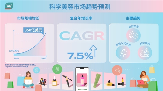 全球美容市场正迎来前所未有的转变,研究报告显示,全球科学护肤市场迅速增长,预测将从2025年的196亿美元增长至2033年的350亿美元,年均复合年增长率达7.5%。#