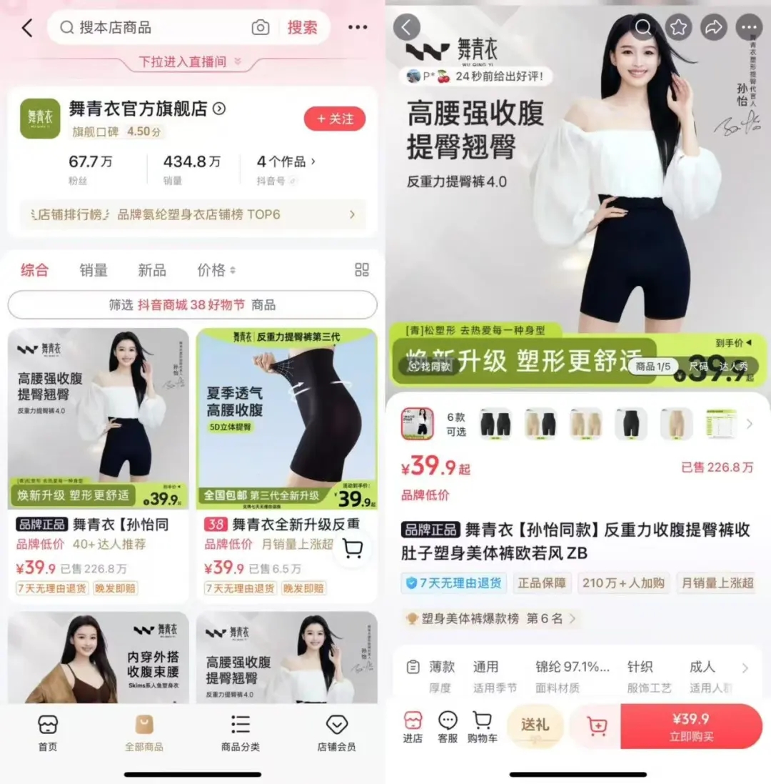 无独有偶,李静在抖音电商经营的内衣裤袜店铺中的某款无痕内裤也卖爆了,因为一条展示穿着无痕内裤练瑜伽的视频在平台上发布一周内获得了百万级别的播放。