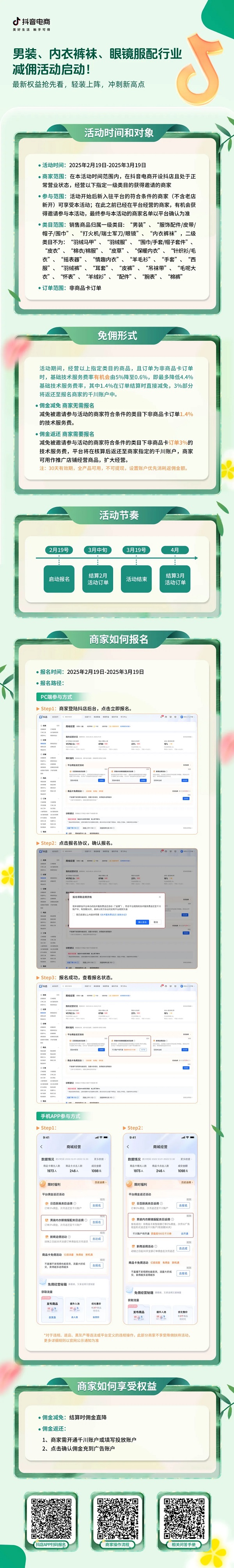 具体来说就是在抖音电商经营指定服配类目(男装、内衣裤袜、眼镜服配)的商家在2.19-3.19活动期间,针对非商品卡订单,基础技术服务费率有机会由5%降至0.6%(仅收取基础支付通道费),其中1.4%在订单结算时直接减免,3%部分将返还至报名商家的千川账户中。