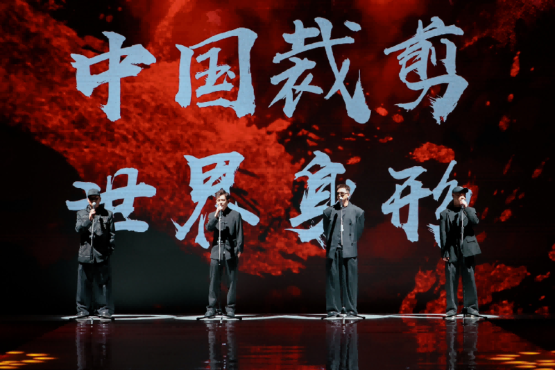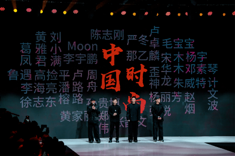 蓄谋已久”的跨界行为艺术,藏着中国设计的野心密码:歌曲大秦号角的吟唱与工业电子节拍,副歌“龙鳞淬火,焚尽标签枷锁”的嘶吼,与秀场「偏见」主题形成互文;高潮处,大屏突现《中国时尚》巨型logo,两届金顶奖得主计文波、新锐设计师黄家丽等几十人名字轮番闪现,齐诵“我是中国服装设计师xxx”,声浪再度如潮水。