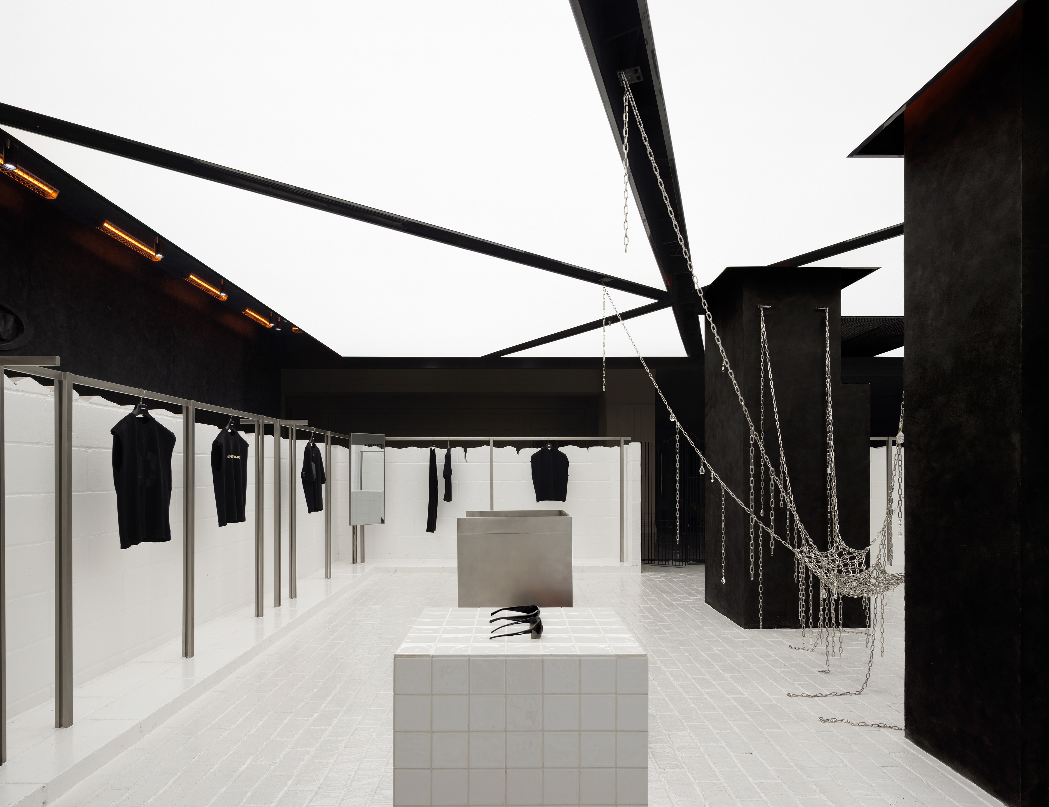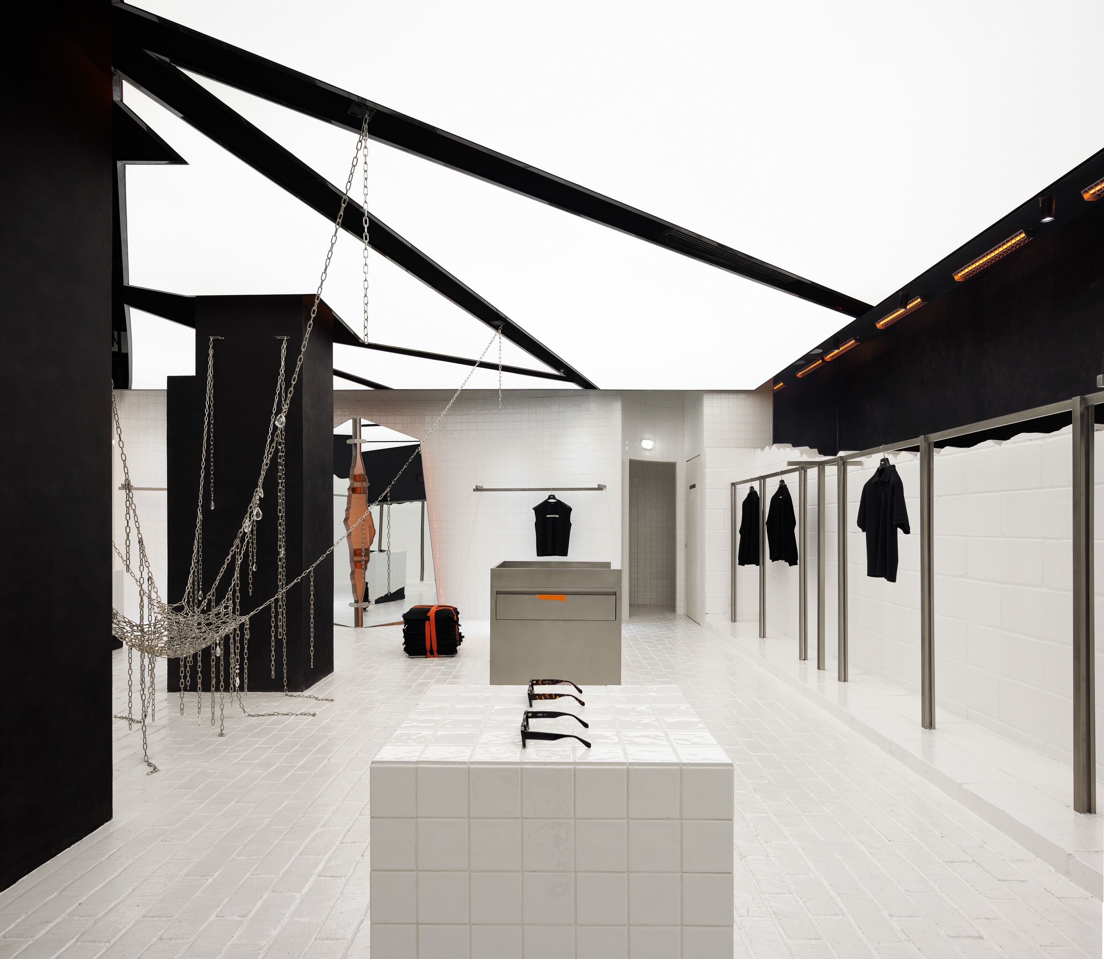 最炸的装置:悬挂铁链吊床、假柱式陈列柜、无限镜式“越狱”试衣间,连门把手都是手铐造型。你不是在逛街,是在一场潮流实验室里探险。