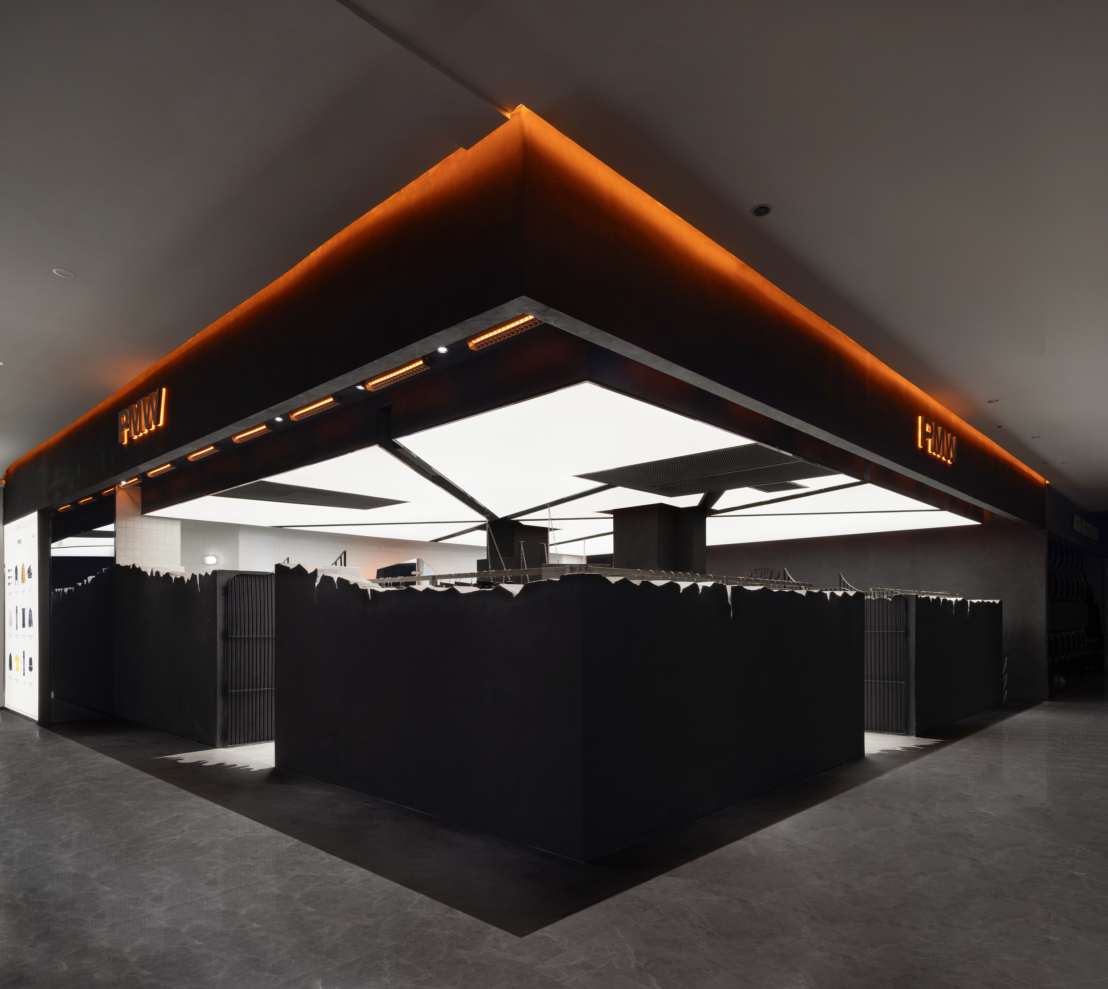 天花部分内外双层设计,橘色呼吸灯营造出如地下派对般的情绪氛围。中央天花采用拼花软膜处理,结合空调与消防需求,依旧保持视觉张力。店铺尽头的弧形墙暗藏玄机——炸裂镜面背后嵌入呼吸灯,机械手臂可翻转镜体,背面则隐藏仓储空间。