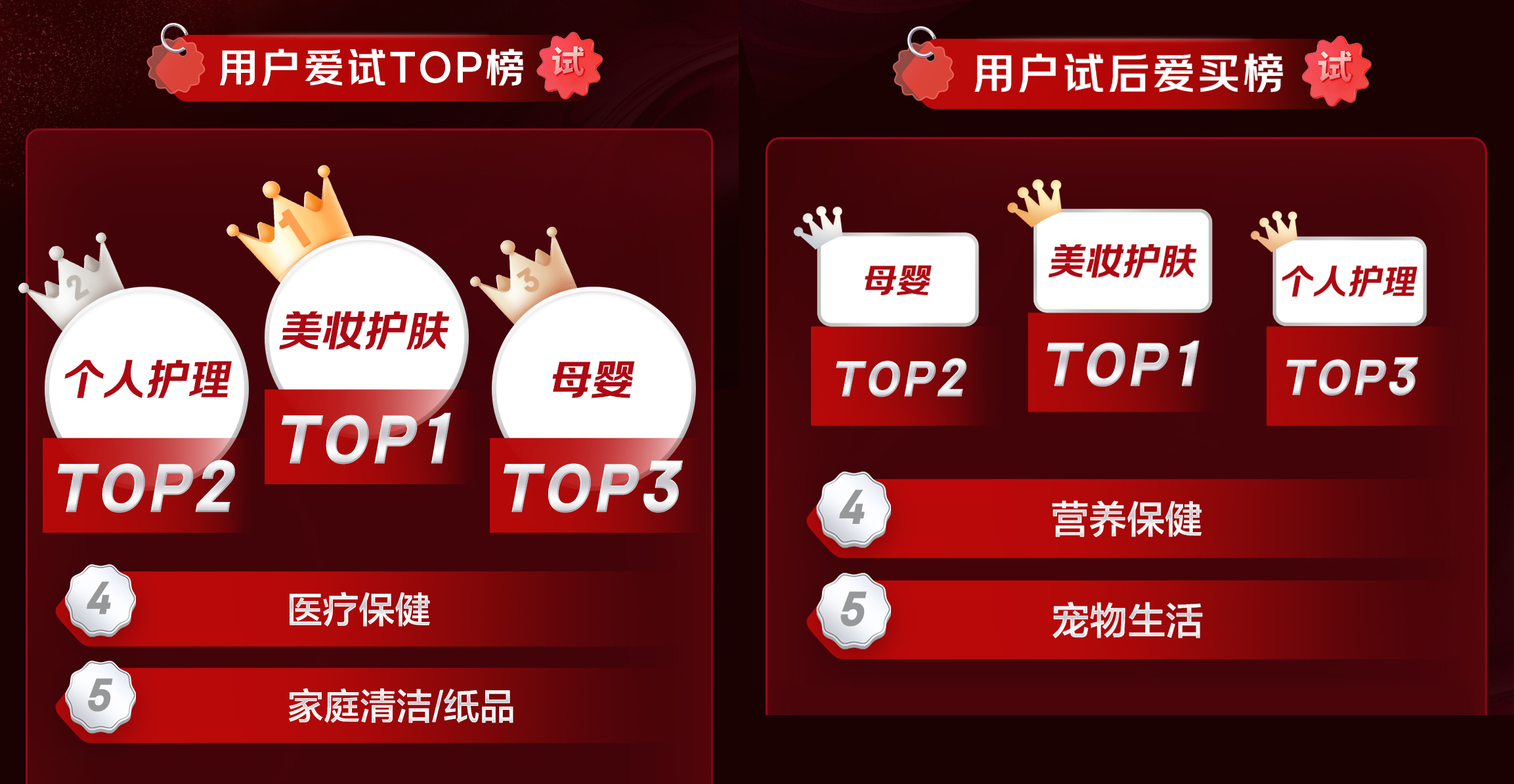 从用户偏好来看,美妆护肤、个人护理和母婴位居“用户爱试榜”前三,医疗保健与家庭清洁/纸品紧随其后;而在“试后爱买榜”中,美妆护肤依然领跑,母婴、个人护理、营养保健及宠物生活类目同样表现突出,显示出试用模式在高体验性品类中的卓越转化效果。