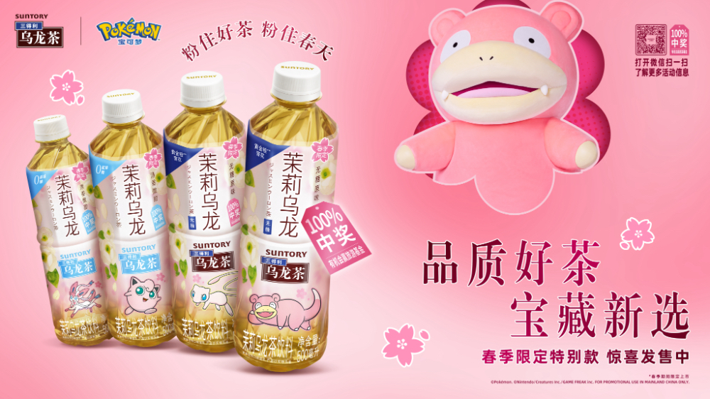 与此同时,三得利茉莉乌龙还推出了春日限定的联名系列产品。在淡雅茉莉清香的萦绕下,三得利茉莉乌龙迎来胖丁、仙子伊布、呆呆兽、梦幻等宝可梦形象的全新包装设计。以明媚浪漫的粉色,装点春日美好时光,一起“粉住好茶,粉住春天”。