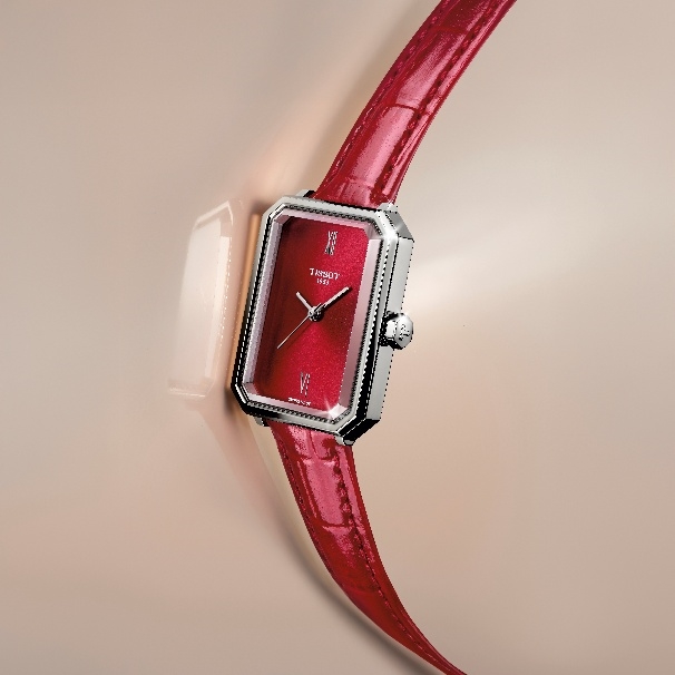 此次在赛场特别呈现的天梭小美人系列芳心款“石榴红”版腕表以1975年经典设计为灵感,融合现代美学再度诠释女性力量。利落的长方形表壳搭配刻面蓝宝石水晶玻璃,彰显几何美感;独特的六边形表冠,恰如现代女性棱角分明的个性宣言;炽烈的红色表盘则呼应着女篮赛场上的热血与魄力。天梭以这枚腕表致敬女性的无穷力量,并在此刻缔造一场关于力量与优雅的对话。