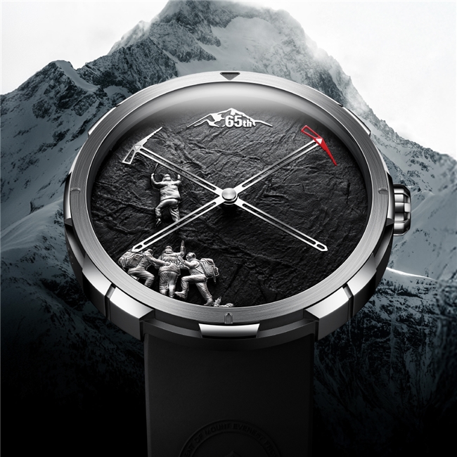 表盘融入珠峰浮雕与「65th」纪念标识,铭记中国攀登者登顶珠峰65周年里程碑时刻。浮雕以精密立体雕刻还原珠峰山体轮廓,层次分明;搭配瑞士super-luminova c1夜光涂层,昼夜皆赏珠峰盛景。冰镐造型指针致敬攀登精神,经精密切割与手工打磨,完美还原工具经典形态;夜光指针与刻度精准呼应,无论何种环境皆可清晰读时,如攀登者手中冰镐,始终指引前行方向。